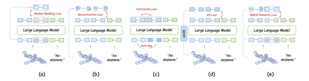 因为缺乏 3D 编码器导致点云语义信息的编码不足,极大地阻碍了 LLM 理解点云的结构细节。现有的大多数 3D 编码器使用自监督损失将点云的高层语义嵌入到 Transformer 中,主要分为四种类型:掩蔽建模损失 (a)、重建损失 (b)、对比损失 (c) 和知识蒸馏损失 (d)。基于 token embedding 模块和 LLM 可学习层,作者在预训练阶段实现并评估了这些损失对无编码器 3D LMM 的影响,并提出混合语义损失。