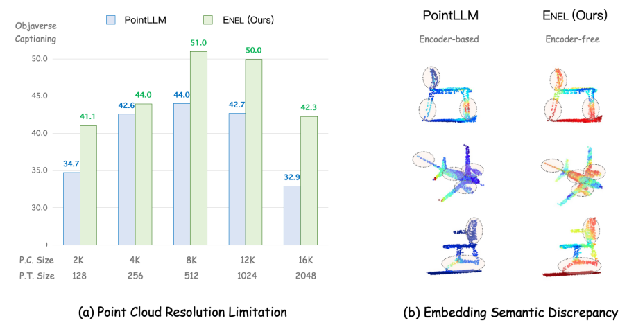 点云分辨率限制:3D 编码器通常在固定分辨率的点云数据上进行预训练,例如 PointLLM 的编码器 Point-BERT 使用 1,024 个点。然而,在推理过程中,输入点云的分辨率可能会有所不同(例如,8,192 个点或 512 个点)。训练和推理分辨率之间的差异可能导致在提取 3D 嵌入时丢失空间信息,从而使 LLMs 理解变得困难。如(a)所示,PointLLM 在不同的点云分辨率输入下性能差异过大,而我们提出的 ENEL 显示出了一定的鲁棒性。