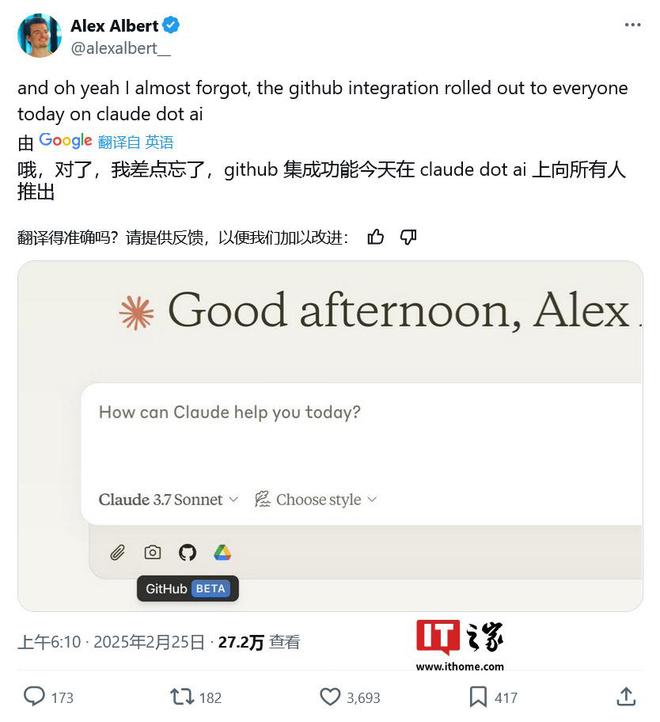 2 月 27 日消息,Anthropic 的 Claude 关系负责人 Alex Albert 于 2 月 25 日在 X 平台发布推文,宣布面向免费、Pro 和 Teams 用户,开放 GitHub 集成 Claude。