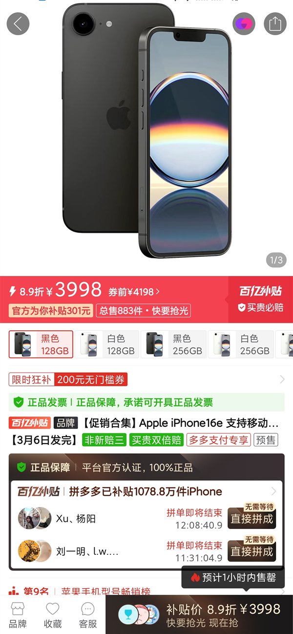 在拼多多百亿补贴频道,iPhone 16e已经跌破首发价,起售价降至3998元,比苹果官网便宜501元。