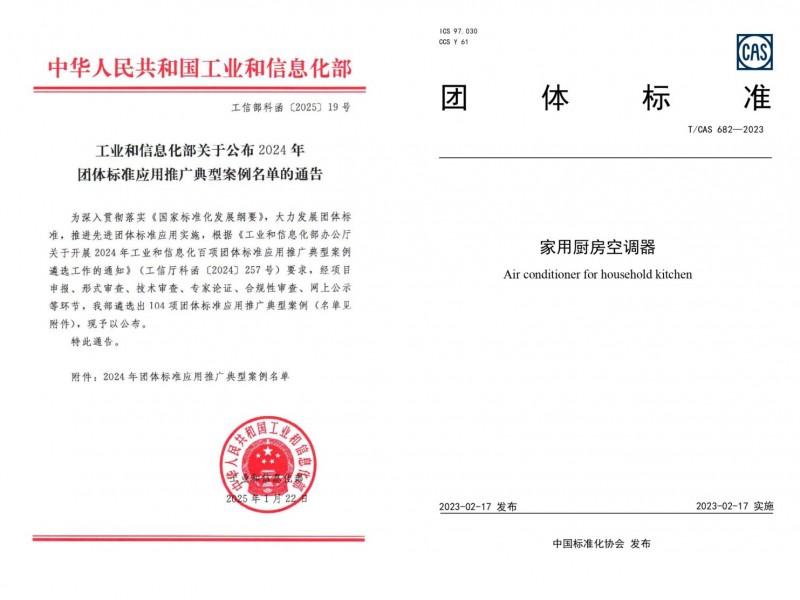 近日,工业和信息化部正式公布2024年“百项团标应用推广典型案例”名单,广东美的制冷设备有限公司主导的T/CAS 682—2023《家用厨房空调器》团体标准荣耀入选。这标志着美的在厨房空调领域的技术实力与创新成果再次获得国家级认可,也展现了美的在推动行业标准化发展中的卓越贡献。