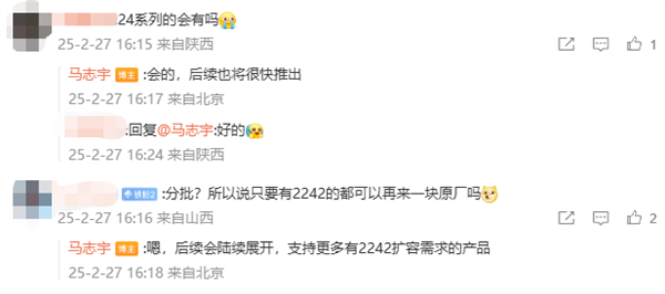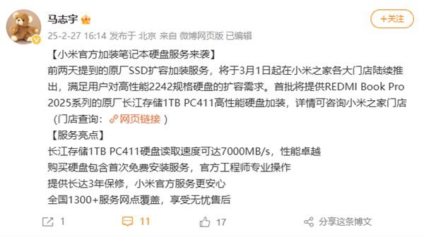 马志宇表示,前两天提到的原厂SSD扩容加装服务,将于3月1日起在小米之家各大门店陆续推出,满足用户对高性能2242规格硬盘的扩容需求,详情可咨询小米之家门店。