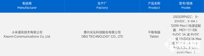 据博主曝光,一款小米旗舰平板入网,型号为25032RP42C,该款平板支持120W闪充。