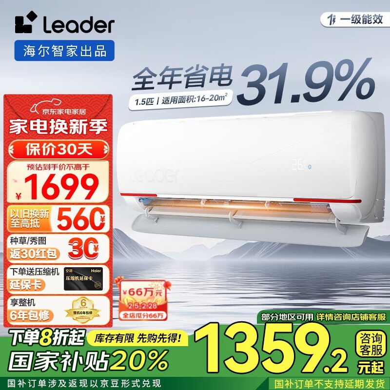 Leader元气空调1匹新一级能效变频壁挂式仅1233元