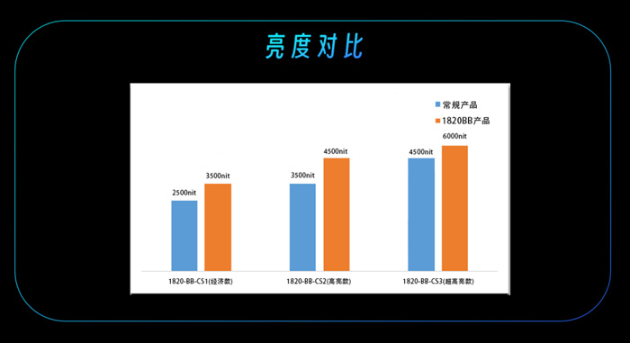 1820-BB-CS3(超高亮款):亮度从4500nit提升至6000nit,适配超高亮度场景要求,在阳光直射下也能呈现清晰明亮的画面。
