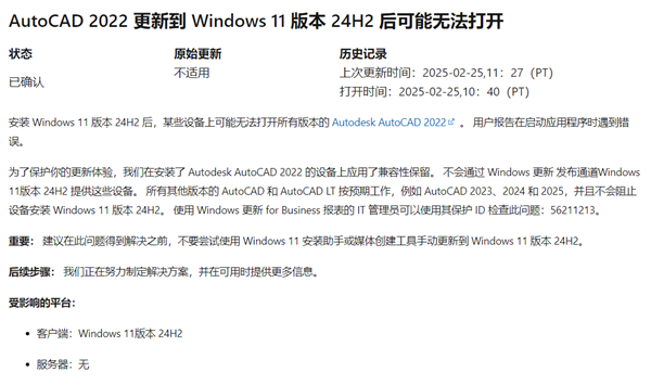 微软表示,AutoCAD 2022在Windows 11 24H2系统上启动时可能会出现错误,导致应用无法打开。
