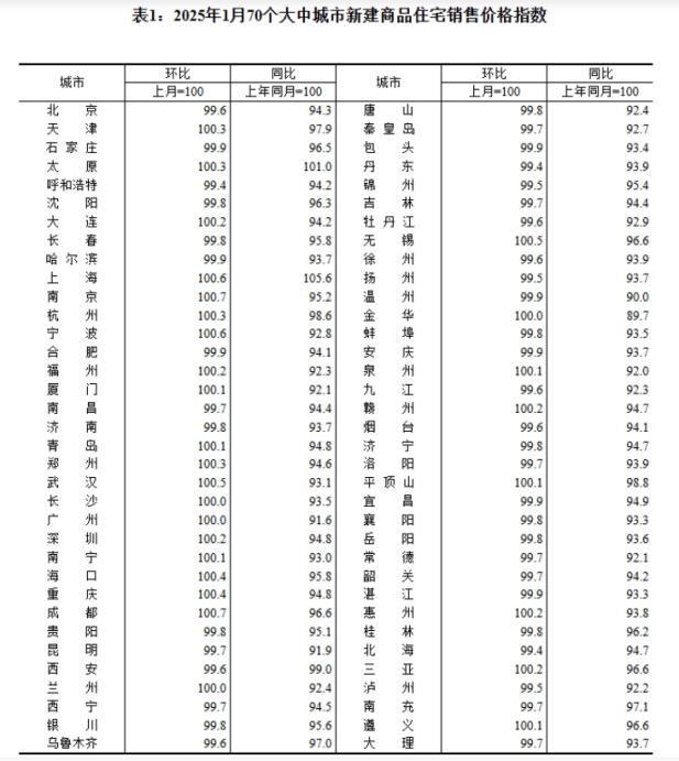 日前,国家统计局发布2025年1月70个大中城市商品住宅销售价格变动情况。其中,新房价格环比上涨城市较上月有所增加,一线城市新房和二手房价格环比均继续上涨。