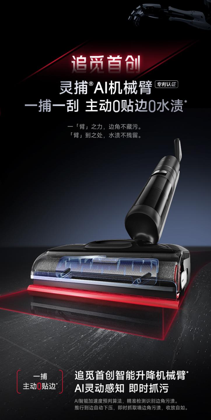 2024年9月,追觅推出了行业首创灵捕智能升降机械臂技术,成为行业首个真正实现0水渍残留和三侧0贴边的技术方案,也是迄今为止行业最强的一项创新性技术之一,获得了莱茵0水渍认证、绿创3侧0贴边双项认证等多项权威机构认证。