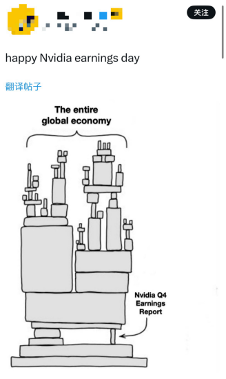 在社交媒体X上,梗图开始出现——全球经济的建筑群最下方,“英伟达第四季度财报”成为支撑整个结构的基石。