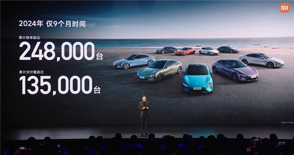 雷军表示,2024年,SU7上市近9个月时间累计锁单超过24.8万台,累计交付13.5万台。