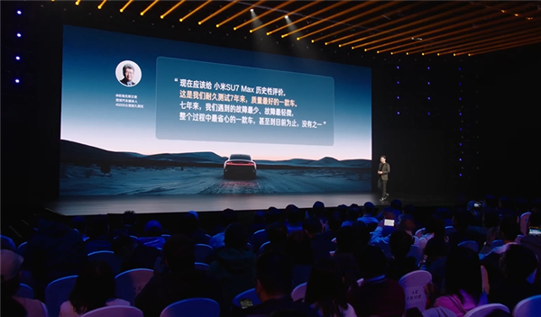 发布会上,雷军着重提及车评人“王垠”对小米SU7的评价,其表示,自己做新车耐久性7年以来,SU7是他见过的质量最好、最省心的一款车,没有之一。