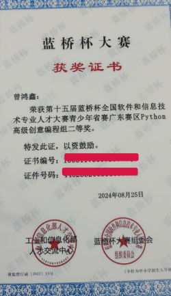 在编程猫的指导下,曾鸿鑫参加了多项编程竞赛,并取得了优异的成绩。他荣获了第15届蓝桥杯省赛二等奖、2023年学生信息素养提升活动二等奖等多项荣誉。这些奖项的获得,不仅是对他个人努力的肯定,更是对编程猫教学品质的认可。编程猫“以孩子为中心”,注重培养孩子的编程思维和解决问题的能力,让孩子在轻松愉快的氛围中学习编程,享受编程带来的乐趣。