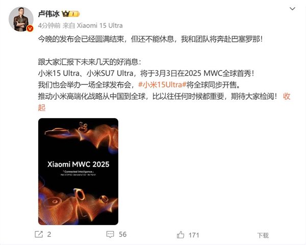 跟大家汇报下未来几天的好消息:小米15 Ultra、小米SU7 Ultra将于3月3日在2025 MWC全球首秀,我们会举办一场全球发布会,小米15 Ultra将全球同步开售,推动小米高端化战略从中国到全球比以往任何时候都重要,期待大家检阅。