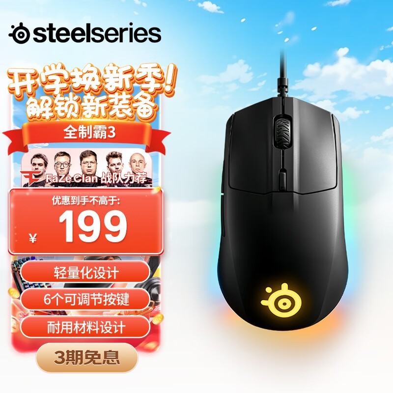 赛睿Rival 3有线游戏鼠标轻量化设计约1680万色RGB灯光
