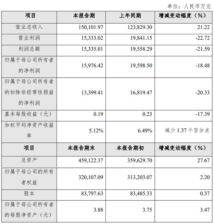 报告期末,公司总资产为 459,122.37 万元,较报告期初增长 27.67%;归属于母公司的所有者权益为 320,107.09 万元,较报告期初增长 2.20%,归属于母公司所有者的每股净资产为 3.88 元,较报告期初增长 3.47%。