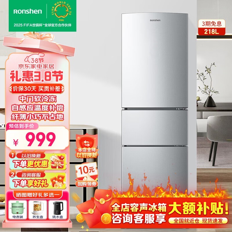 容声BCD-218D11N三门冰箱银色拉丝面板节能静音小户型家用