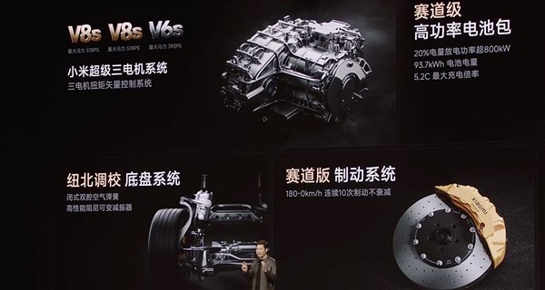 核心动力和续航方面,小米SU7 Ultra搭载一台前轴V6S电机和两台后轴V8S电机,综合马力1548匹,零百加速2.1秒,设计最高时速超350km。