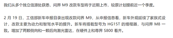 曝问界M9改款车型近期上市 较原计划提前近一个季度