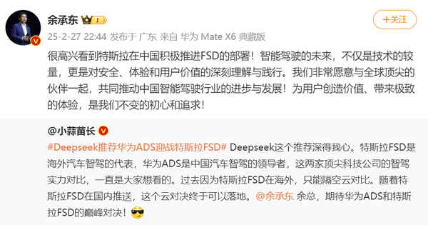 【CNMO科技消息】近期,特斯拉在中国部署FSD(全自动驾驶)系统的消息引发了广泛关注,众多车企纷纷表示要与之较量。作为国内智能驾驶领域的佼佼者,华为自然也不甘落后。2月27日晚,余承东发文称,很高兴看到特斯拉在中国积极推进FSD的部署!智能驾驶的未来,不仅是技术的较量,更是对安全、体验和用户价值的深刻理解与践行。