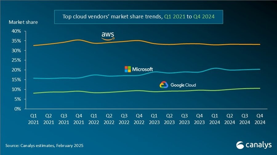 亚马逊网络服务(AWS)在2024年第四季度保持了其在全球云市场的领导地位,占33%的市场份额,并实现了19%的同比增长。2024年,AWS的云基础设施收入超过1000亿美元,继续保持领先地位。