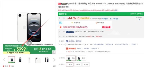 也就是说,iPhone 16e入门版本最高仅需3999元即可拿下,还能叠加依旧换新等补贴,而官网则需要4499元,当然还是国补更香。