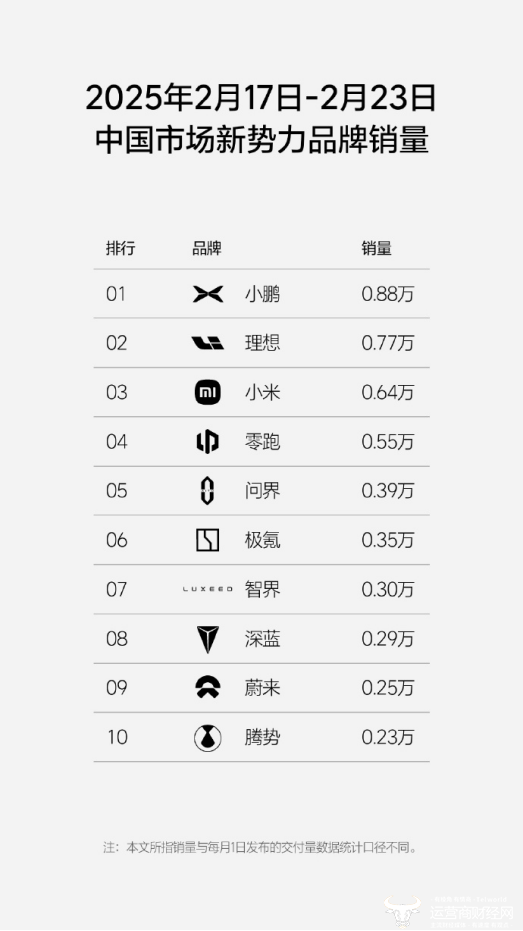 具体来看,在2025年2月17日-2月23日期间,小鹏汽车的周销量为0.88万辆,位于榜单首位;第二名则是理想汽车,在本周的销量为0.77万辆;排在第三名的小米汽车周销量为0.64万辆,第四至第十名分别为零跑汽车、问界、极氪、智界、深蓝汽车、蔚来以及腾势汽车。