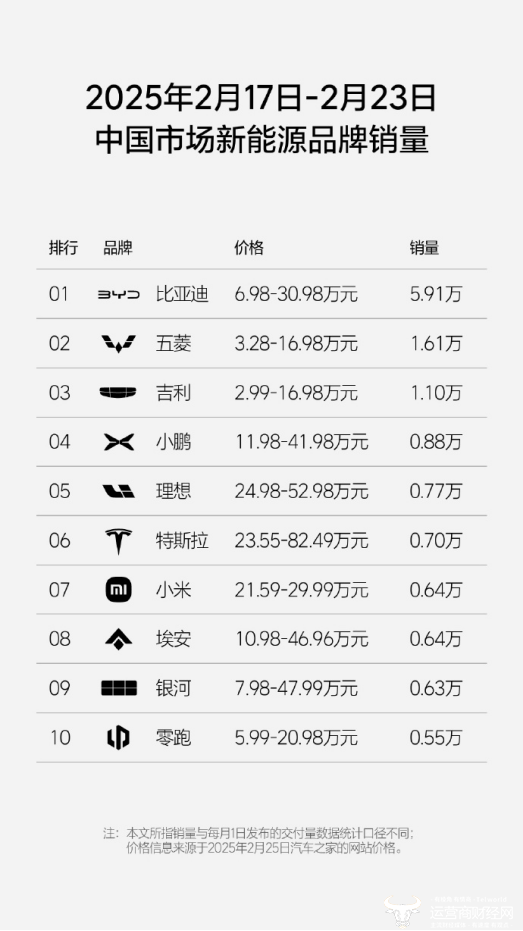 另外,即便是将范围扩大到整个新能源品牌,小鹏汽车的销量表现依旧可圈可点。在2025年2月17日-2月23日中国市场新能源品牌销量周榜中,小鹏汽车以0.88万辆的销量排在第四位,前三名分别是比亚迪、五菱以及吉利汽车,均为老牌车企。