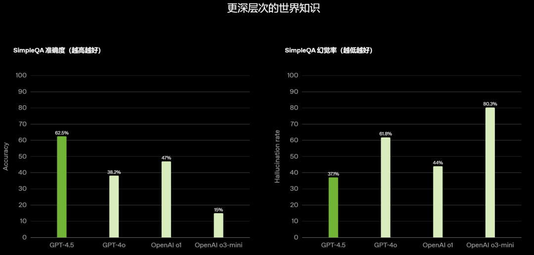图 | GPT-4.5 的 SimpleQA 测试成绩,SimpleQA 旨在使用简单但具有挑战性的知识问题来衡量大模型的真实性(来源:OpenAI)
