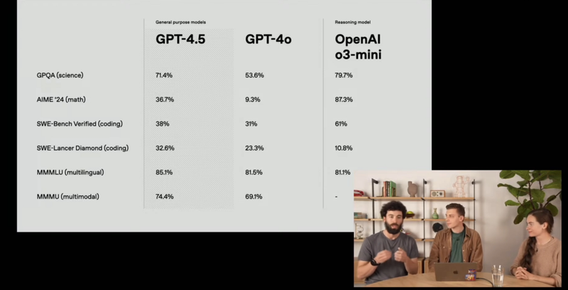 “OpenAI推广AI有两种方式——推理和无监督学习,我们相信模型的推理能力很重要,但GPT-4.5实际上处于无监督学习的前沿,它有更多知识并且更聪明,会成为未来更强大模型的基础。”米娅在直播中表示。