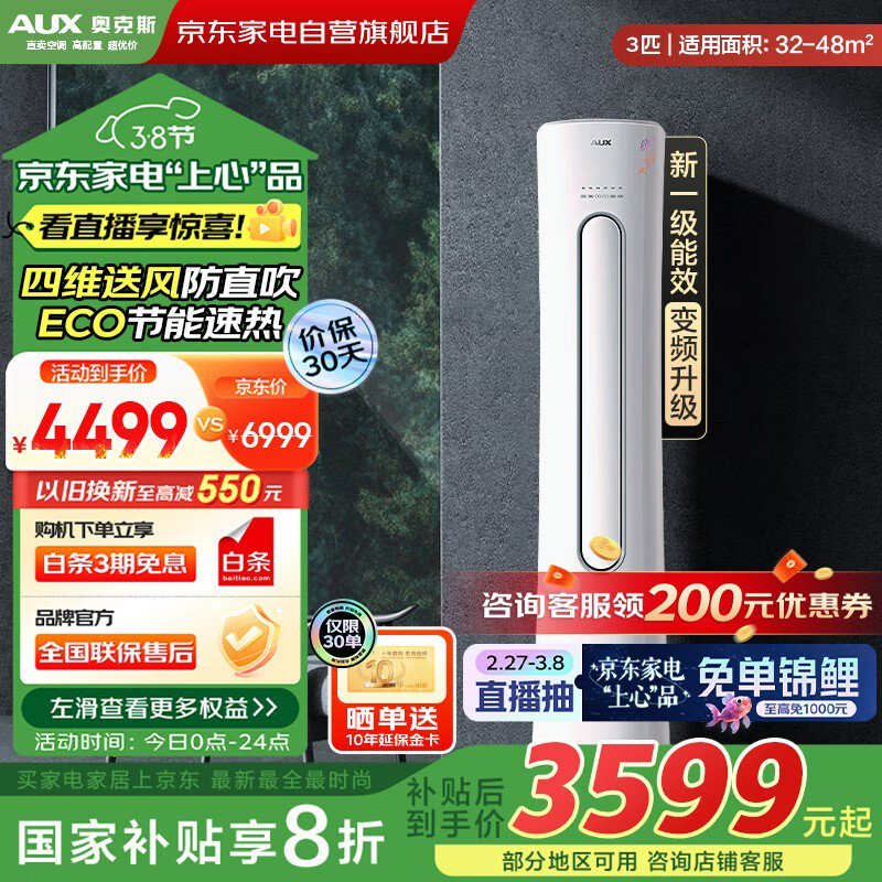 奥克斯3匹空调柜机KFR-72LW促销到手价3522元