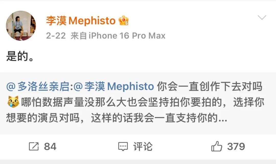 网友@多洛丝亲启 提问李漠:你会一直创作下去对吗?哪怕数据声量没有那么大也会坚持拍你要拍的,选择你想要的演员对吗?