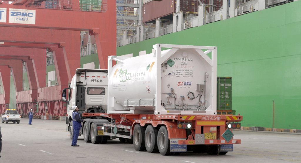 1月底,荷兰鹿特丹港内,一艘大型集装箱船缓缓驶向码头。随着船舶靠岸停稳,工作人员有条不紊地将一个大型液化罐卸岸装运,罐内装满了从船舶尾气中捕集的二氧化碳。