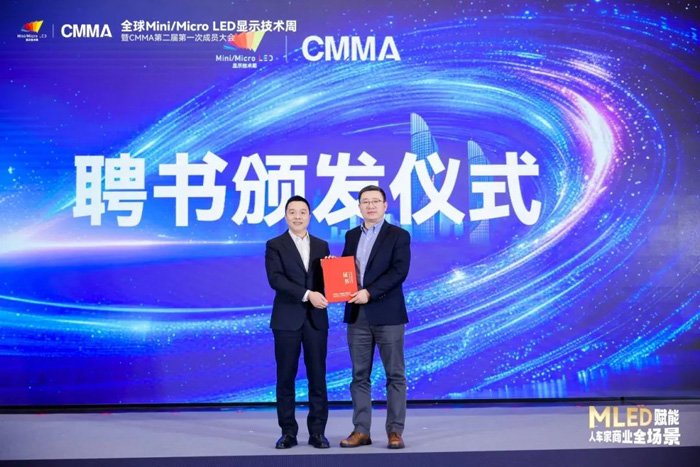 在聘书颁发环节,中国电子视像行业协会副会长彭健锋为天马微电子董事长彭旭辉颁发CMMA会长聘书。