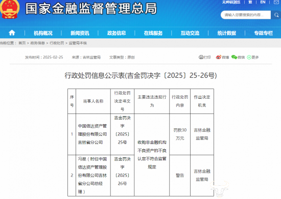 2月25日,国家金融监管局发布的行政处罚信息公示表显示,中国信达资产管理股份有限公司吉林省分公司,因“收购非金融机构不良资产的不良认定不符合监管规定”被罚款30万元,另时任该分公司的总经理冯星被警告。