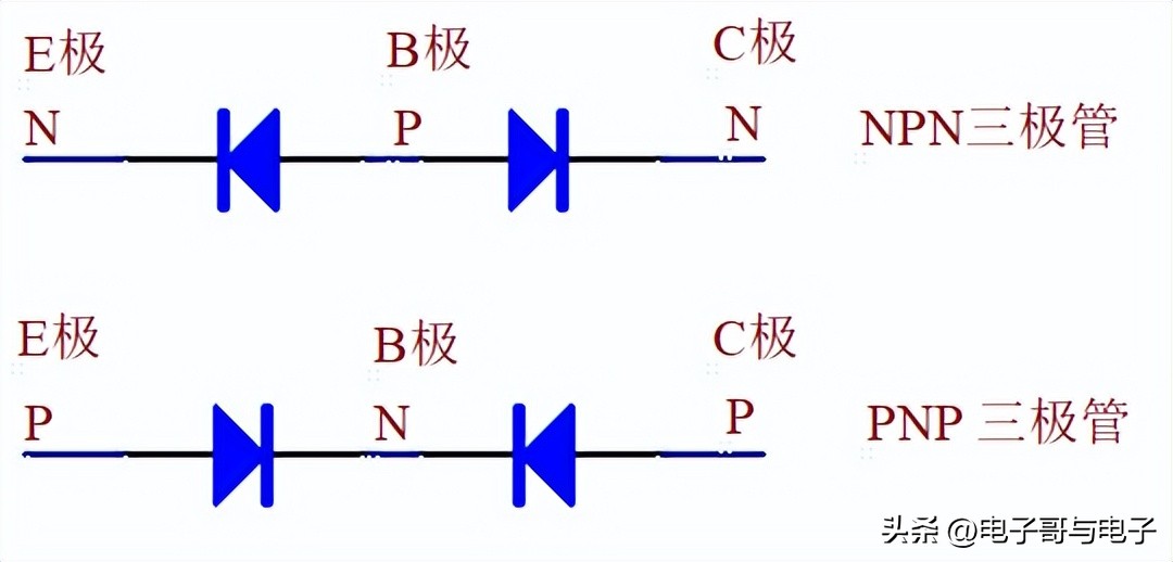 三极管种类大致分2种,一种NPN型三极管,另外一种为PNP三极管。三极管由2个PN结组成。因此,我们可以将三极管看作由2个二极管组成。通过下图可以知道,三极管的公共端为B极(基极)。