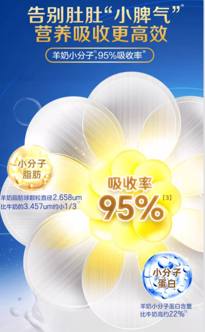 首先,从产品品质角度看,佳贝艾特悦白选用荷兰北纬52° 的莎能山羊奶作为奶源,山羊奶天生具有比羊奶小1/3的脂肪球直径,小分子蛋白也更多,科研实证吸收率高达95%,对于肠胃敏感消化不好的宝宝非常友好。而在配方方面,这款小分子羊奶粉中添加了41种配方营养,远超市面上的同类产品,其中包含168亿活性益生菌和专利OPO,能在提高宝宝吸收效率的同时优化宝宝的肠道环境,减少宝宝肠胃不适现象的发生几率,让宝宝轻松长高长肉。