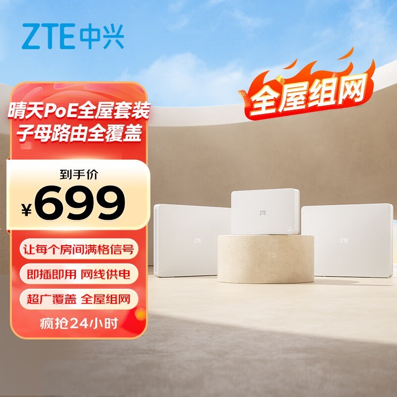 中兴星云系列晴天PoE全屋路由1母2子套装Wi-Fi6京东特惠