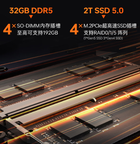 曙光18Pro是首款采用4x4存储矩阵设计的笔记本,4x4可拓展存储矩阵,为用户提供了极为灵活的存储扩展方案。其配备的四个SO-DIMM内存插槽,最高支持192GBDDR5内存。 同时,四个M.2PCIe超高速SSD插槽为用户提供了充足的存储空间,并支持高达2TSSD5.0的存储容量。通过这套存储矩阵设计,用户可以根据需求灵活调整内存和存储配置,实现性能与扩展性的平衡,满足从小型办公到大型工作负载的多元化需求。