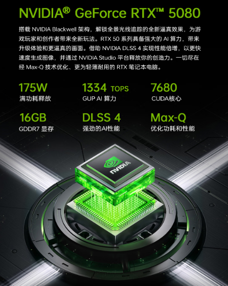 曙光18Pro搭载NVIDIA® GeForce RTX™ 5090显卡,配备16GB GDDR7显存,显存位宽达到256bit,支持全功耗释放,最大可达175W。5090显卡是目前市面上的最强显卡,在AI加速、游戏与创作等多个领域都能够提供超棒体验。DLSS 4.0技术,能够提供更高效的图像渲染与画面质量,同时降低延迟。