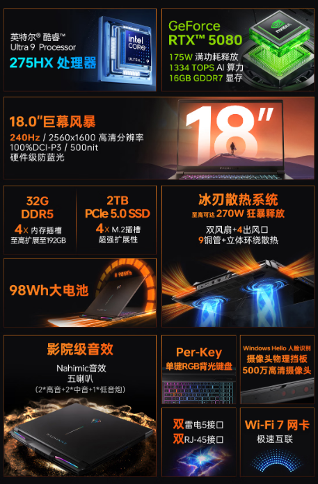 曙光18Pro配备了英特尔® 酷睿™ Ultra 9 Processor 275HX,这款处理器以其强大的计算能力,为复杂的创作任务、AI运算及高负载工作提供了可靠保障。Ultra 9 275HX通过多核心架构提供优异的多任务处理能力,能够在繁重的工作负载下保持高速响应,这一性能级别,使得曙光18Pro不单单是一个娱乐工具,更是专业创作、工程设计及数据处理的强力助手。