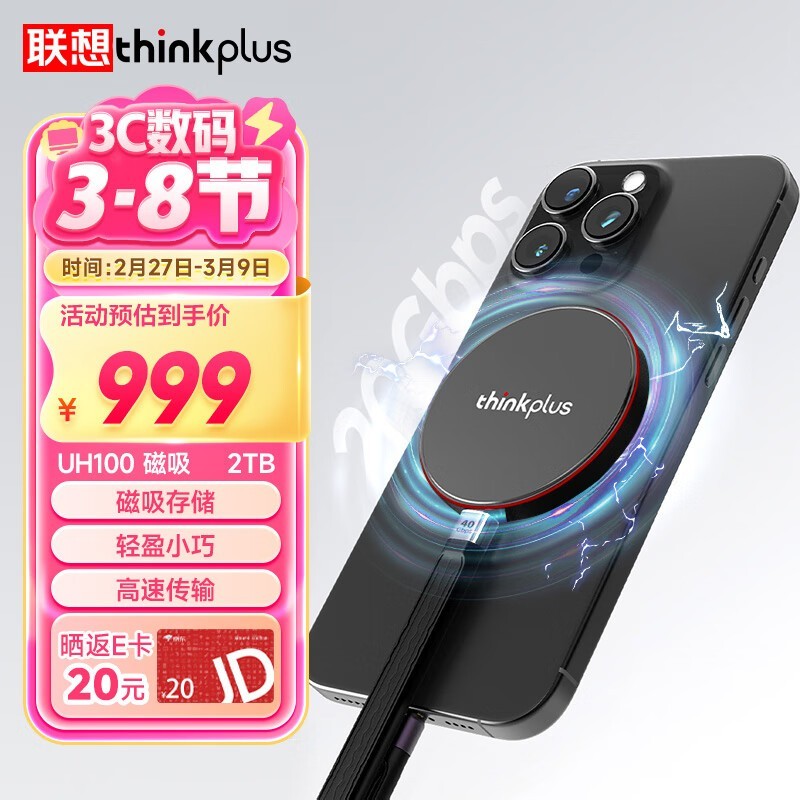 thinkplus联想2TB磁吸移动固态硬盘高效存储便捷使用