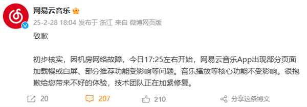 随后,网易云音乐官微发布致歉声明:初步核实,因机房网络故障,今日17:25左右开始,网易云音乐App出现部分页面加载慢或白屏、部分推荐功能受影响等问题。