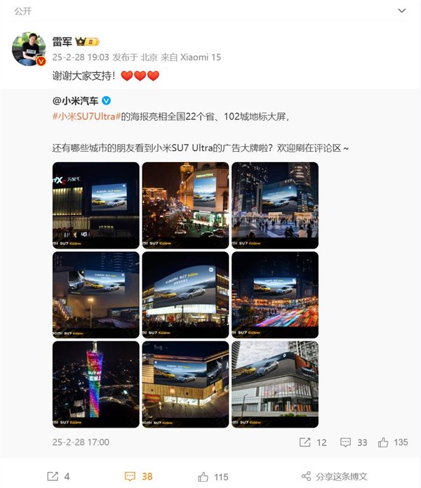 快科技2月28日消息,今天,小米汽车官方晒出小米SU7 Ultra线下海报,这张海报登上全国22个省、102城地标大屏。