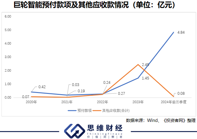 市场关注的其他应收款问题,2024年4月26日,该款项已经收回。不过,在巨轮智能收回其他应收款的同时,公司预付款项的账面金额却在快速上涨。2022年末,巨轮智能的预付款项账面金额仅为2703万元,2023年末已增长至1.45亿元,2024年第三季度末更是增加至4.84亿元。而2024年前三季度,巨轮智能的收入同比仅有64.89%的增长。
