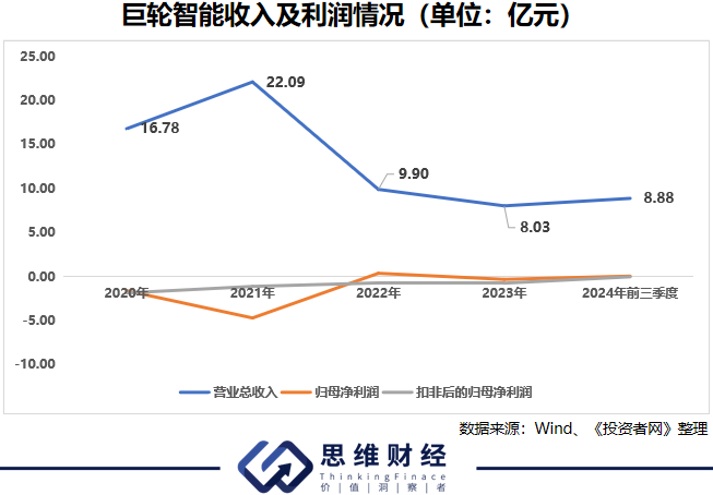 2020年、2021年公司收入增长之后,2022年、2023年巨轮智能的收入就呈现明显的下降趋势。而受行业竞争加剧、毛利率下降影响,自2019年开始,巨轮智能的扣非净利润就长期为负。2024年,受应收账款及存货减值影响,当期公司更是出现了1.2亿元-1.8亿元的亏损,亏损较2023年相比有明显的扩大。