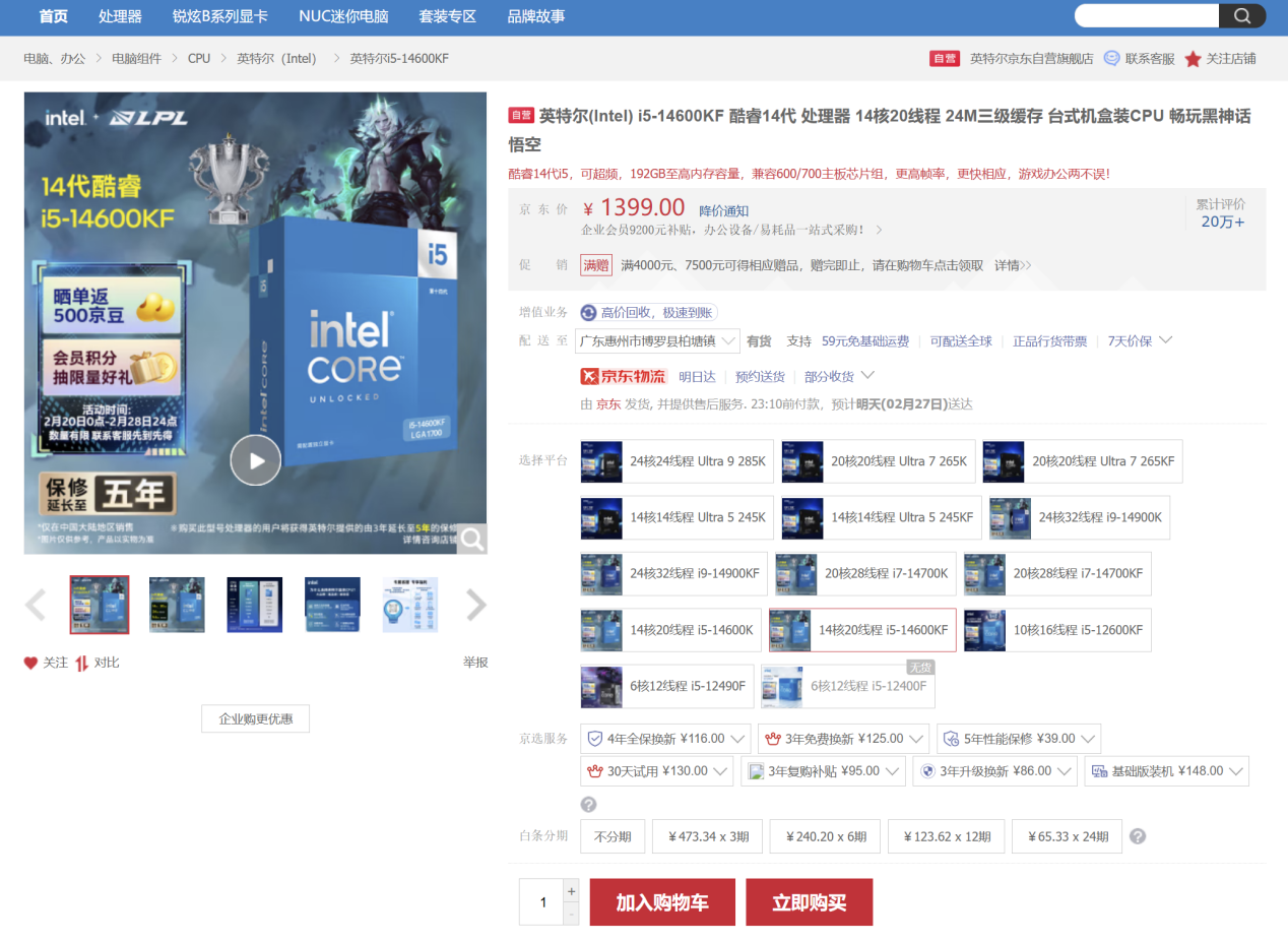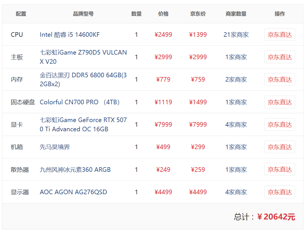 今天看的这套配置整体来看没有大的问题,除了CPU搭配这块主板有些过于奢华以及电源功率较为宽裕外,适合绝大多数想要购买RTX 5070 Ti的朋友参考选购。CPU方面选择了目前性价比颇高的i5 14600KF,其拥有14核心20线程(6个性能核+8个能效核),采用Raptor Lake架构和Intel7(10nm)工艺,三级缓存24MB,最大睿频5.3GHz,基础功耗125W,最大功耗约181W,在生产力和游戏两个方面均拥有领先同价位的水平。目前官方店铺售价仅1399元,叠卷凑单到手仅1259元,仅为原价的一半,性价比爆棚。