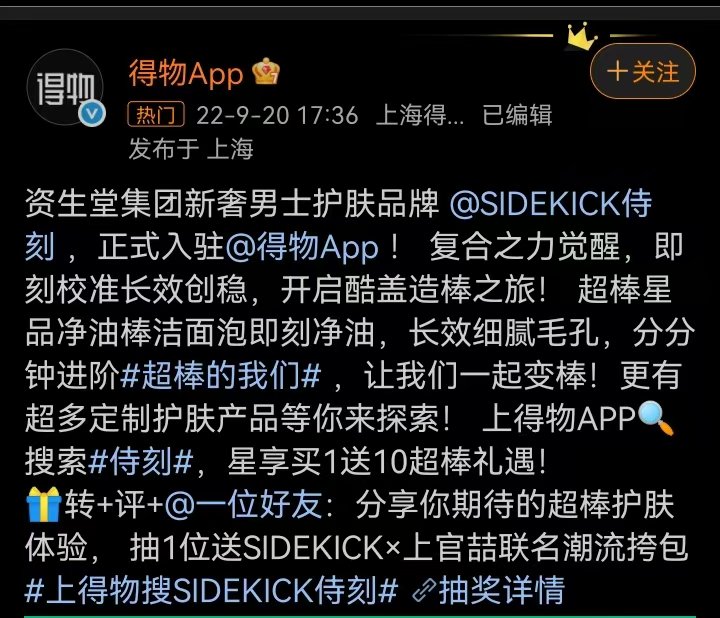【亿邦原创】日前,有媒体报道称,资生堂旗下男士护肤品牌SIDEKICK侍刻退出中国市场。目前,在淘宝App已无法搜索到SIDEKICK官方店铺,在小红书已无法搜索到官方账号;官方微博、微信公众号尚未注销,但均在2024年3月后便再未更新,B站官号则于2023年8月后便再未更新。