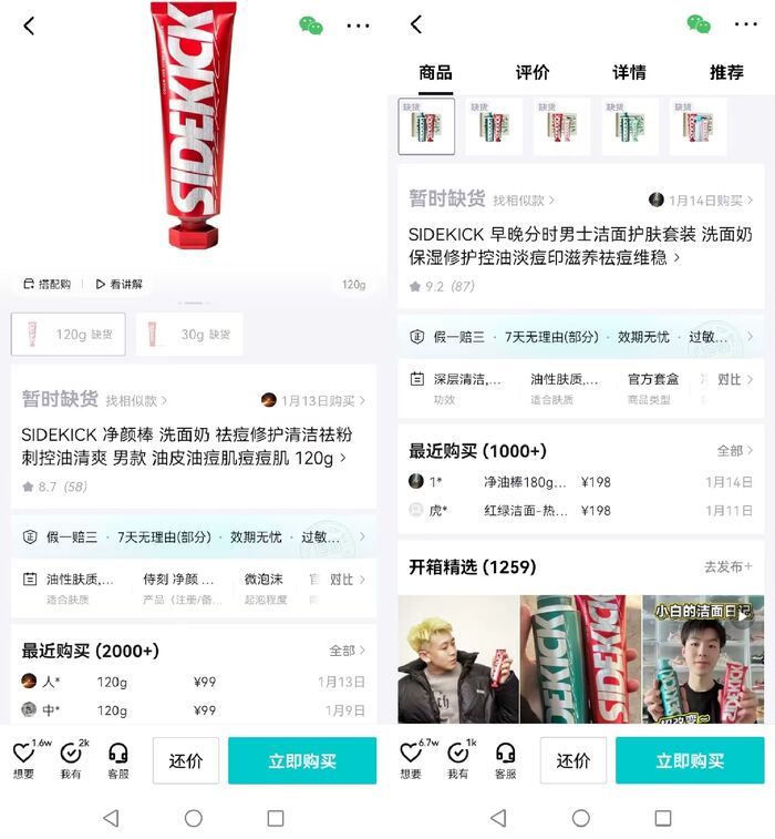 品牌得物官方店铺显示,该品牌是“新奢复合男士护肤品牌”,由资生堂集团专为亚洲男士定制。得物店铺内购买记录显示,SIDEKICK旗下120g的净颜棒洗面奶定价99元,洁面护肤套装定价为147元至198元不等。
