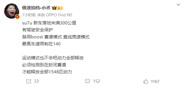 可能有人担心,马力如此之大,普通人能否驾驭得了小米SU7 Ultra?而据汽车博主“极速拍档-小乔”确认,这款车有驾驶安全保护模式。