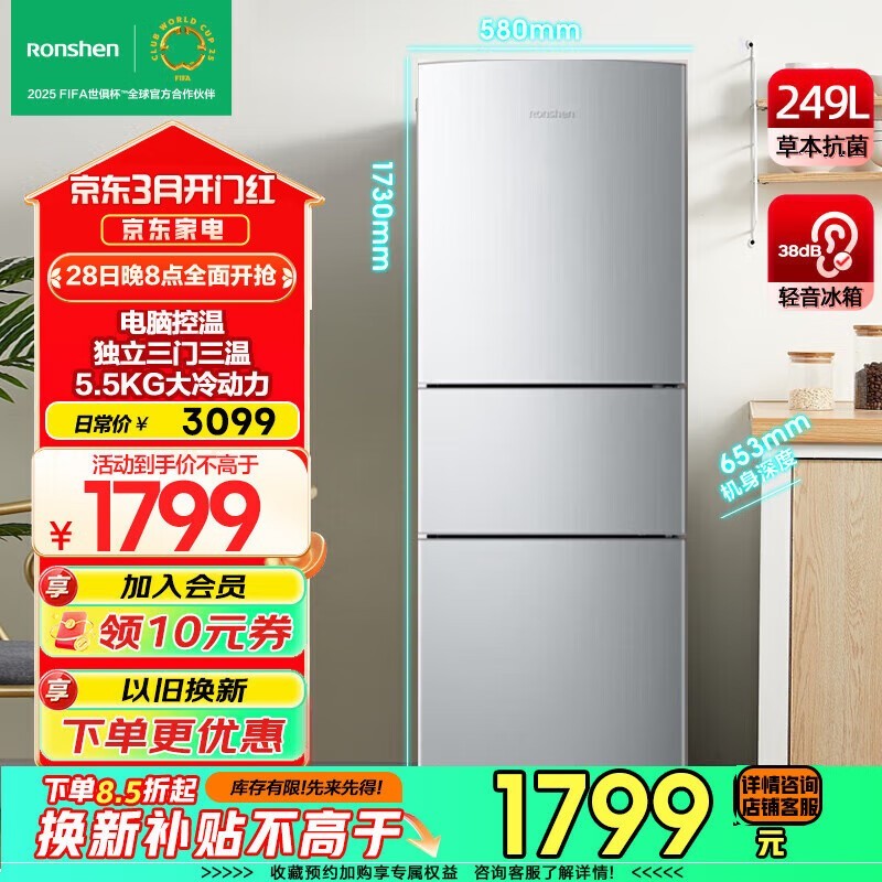 容声249升三开门小电冰箱BCD-249WD1N京东好价直降
